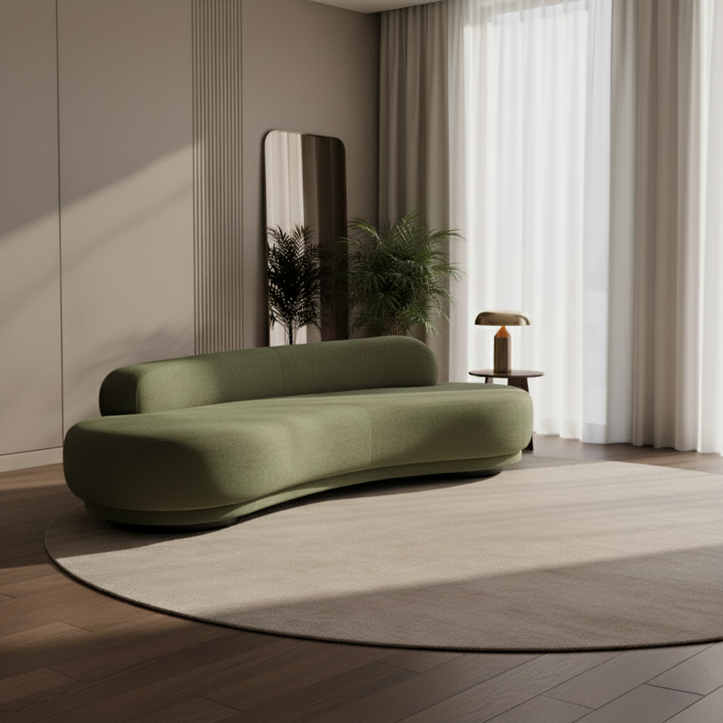 The Cavo Sofa is where bold form meets elevated comfort. With its sculptural curves and signature kidney-shaped silhouette, Cavo introduces a fluid sense of movement to any room. The fully upholstered back, seat, and secondary base create a soft, seamless visual language, while the asymmetrical backrest adds a distinctive focal point without compromising support.